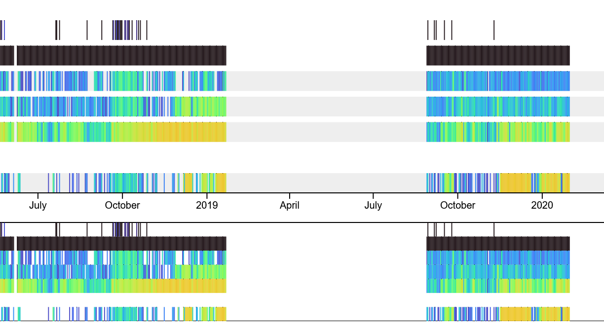 An interactive plot of daily GPS hits, antenna pulses, and filtered tag detections at a given station. Time is plotted on the X axis and each tag or device (gps/antenna) are plotted as a categorical variable on the Y axis. Data are represented as coloured bars with the intensity increasing with the count of detections for that given variable. An additional row on the top of the plot displays the deployment periods as coloured boxes (colour of box changes with each deployment).